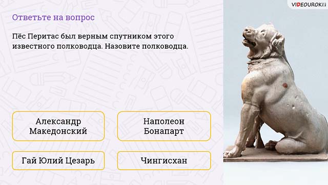 После каждого вопроса вы можете узнать дополнительную информацию. Например, что в свите Александра Македонского был один воин, чья преданность не знала ни страха, ни сомнений. Звали его Перитас, и был он не воином, а псом, тенью следующим за своим великим хозяином.