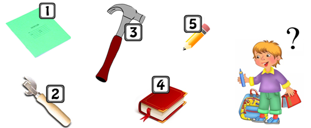 3. (3 балла) Помоги Саше собраться в школу. Укажи номера предметов, которые нужно положить в портфель.