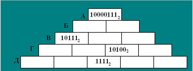 5. (4 балла) Известное число – это сумма чисел в двух клетках под ним. Следуя этому правилу и учитывая, что на уровне Д кроме числа 11112 находятся числа 112, 10112, 102, 1012, заполните клетки пирамиды в десятичной системе счисления.