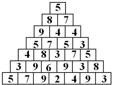 4. (4 балла) В пирамиде все числа записаны в системе с основанием 16. Пройдите от вершины пирамиды к её основанию, переходя из каждой клетки в одну из расположенных прямо под ней, и наберите по дороге сумму 2D16.