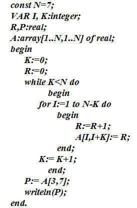 8. (5 баллов) Пусть задана квадратная матрица А размера N × N (где N=7). В программе, написанной на языке Pascal, производится обработка в соответствии с программой: