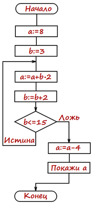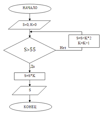 1. (3 балла) Посмотрите на блок-схему алгоритма. Чему будет равно число S после выполнения этого алгоритма, если первоначально К = 0 и S = 0?