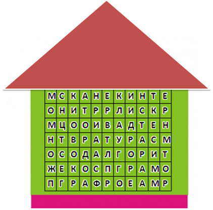 6. (4 балла) Найдите в лабиринте букв слова, связанные с информатикой и компьютером. Из оставшихся букв составьте ещё одно слово и выберите для него правильное определение.