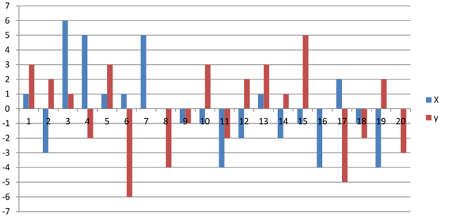абсцисс расположены номера ходов, а по оси ординат – значения X и Y. Всего исполнитель Рисовальщик сделал 20 ходов.