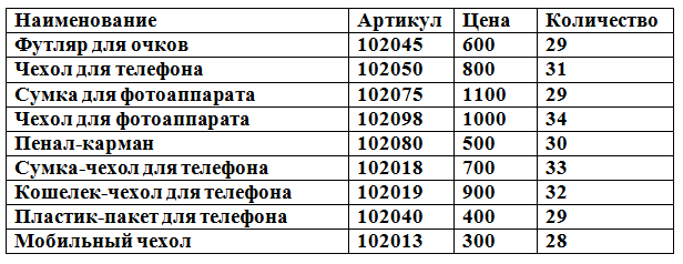 10. (5 баллов) В магазине проводится ревизия остатков мобильных товаров. Получилась следующая таблица: