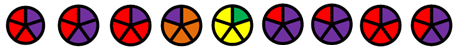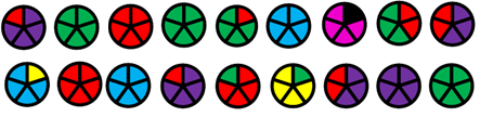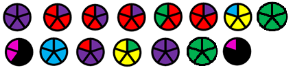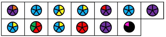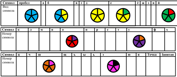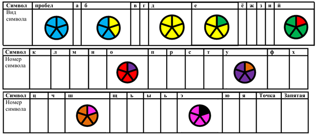 8. (5 баллов) Одним из простых способов кодирования является замена одного символа другим или комбинацией символов. Пусть символы текста закодированы кружками, разделенными на несколько секторов одинакового размера, но, возможно, разного цвета. Известно, что коды двух соседних символов отличаются цветом только одного сектора. Также известно, что после появления в коде очередного символа сектора такого цвета, который не использовался для предыдущих символов, в коде каждого последующего символа появляется еще один сектор такого же цвета, прилежащий к предыдущему по часовой стрелке, пока все сектора не заполнятся этим цветом.
