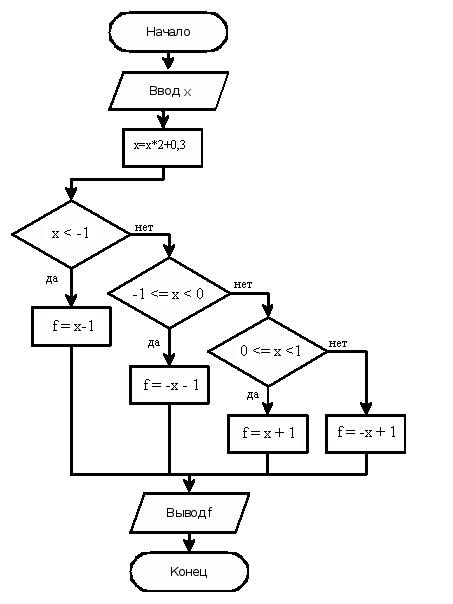 1. (3 балла) Посмотрите на блок-схему алгоритма. Чему будет равно число f после выполнения этого алгоритма, если первоначально