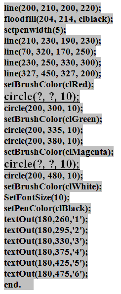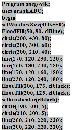 4. (4 балла) В результате выполнения следующей программы, написанной на языке PascalABC, должен получится рисунок снеговика. Какие координаты должны иметь пуговицы номер 1 и 5, если пуговицы в средней и нижней частях снеговика находятся на одинаковом расстоянии друг от друга (для каждой части снеговика своё расстояние)?