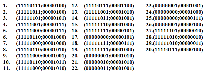 2. (3 балла) Переведите числа, записанные в двоичном восьмиразрядном дополнительном коде, в десятичную систему счисления. Не отрывая руки, отметьте полученные точки на координатной плоскости. Изображение какого животного получится?