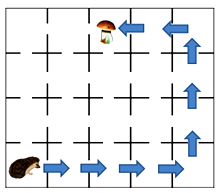 (3 балла) Ёжик подошёл к грибочку, сделав 9 шагов. Каждый шаг обозначен стрелкой. А можно ли было дойти до гриба, сделав меньшее количество шагов? Какое наименьшее количество шагов мог сделать ёжик до грибочка, если идти можно только через проходы в клеточках и в каждую клеточку ёжик делает по одному шагу? Ответ запиши только числом, например, 3