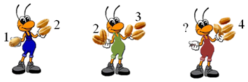 (4 балла) Внимательно посмотри на первых двух муравьёв. По сколько зёрнышек они держат в каждой лапке? Найди закономерность и подумай, сколько зёрнышек надо положить в пустую лапку третьего муравья. Ответ запиши только числом, например, 3