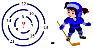 (2 балла) Марине надо провести шайбу в центр трёх колец. В каждом кольце по трое ворот. В воротах указано количество очков, которые можно набрать, проведя шайбу через них. Какое наибольшее количество очков может набрать Марина, если через каждое кольцо к центру можно пройти только один раз? Ответ записать только числом без буквенного обозначения, например, 5