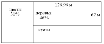 10. (5 баллов) Участок прямоугольной формы засажен кустами, деревьями и цветами так, как изображено на рисунке. Участок, засаженный деревьями, имеет размеры 126,96 х 62 м и составляет 46% от общей площади участка. Найдите длину участка в метрах, если известно, что участок с цветами занимает 31% от общей площади участка. В ответе укажите только число без пробелов и каких-либо знаков препинания. Например, 123