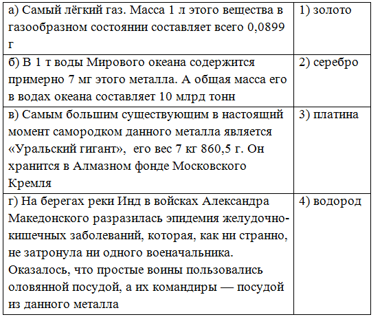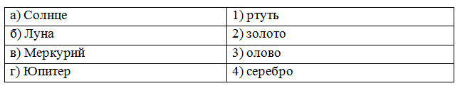 8. (3 балла) В Средние века были известны только 7 металлов и 7 планет. Алхимики считали, что эти металлы рождаются в недрах Земли под влиянием лучей соответствующих планет. Была составлена таблица соответствия планет и металлов. Установите соответствия между планетой и металлом. Ответ запишите в виде последовательности букв и цифр без пробелов и без каких-либо знаков препинания; буквы должны идти в алфавитном порядке. Например, а1б2в3г