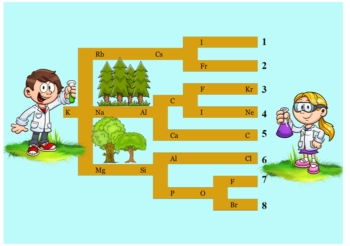 9. (7 баллов) Для того чтобы Джиму, доктору Ливси и капитану Флинту добраться до сокровищ, им необходимо выбрать правильный путь. Известно, что правильным будет тот путь, на котором им встретятся электронные формулы атомов элементов в следующей последовательности: Na → Cl → Al → Ne → Si. По какому пути отправятся кладоискатели? Ответ запишите в виде числа без указания единиц измерения, например, 3