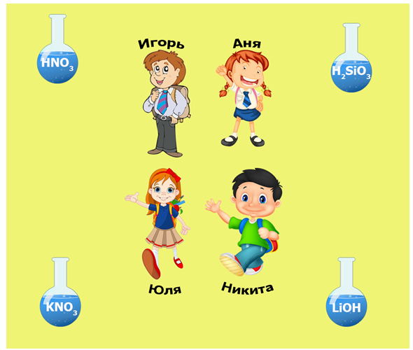 8. (6 баллов) Каждый из ребят получил какое-то из четырех веществ, находящихся в колбах. Известно, что Игорь получил вещество, не относящееся к классу солей.
