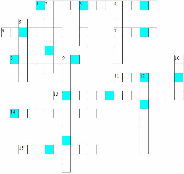 По горизонтали: 1. Процесс, обратный плавлению. 6. Бывает кинетическая, потенциальная и внутренняя. 7. Единица измерения величины заряда. 8. Произведение силы тока и напряжения. 11. Элементарная частица, открытая в 1910-1913 годах Р. Милликеном и А. Иоффе. 13. Физическая величина, характеризующая свойство проводника уменьшать скорость упорядоченного движения свободных носителей зарядов в проводнике. 14. Физическая величина, единицей измерения которой служит вольт. 15. Двояковыпуклая линза в теле человека.