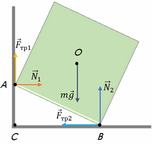 1. (1 балл) Однородный сплошной кубик установлен так, что одним своим ребром он опирается на вертикальную стену, а другим ребром — на горизонтальный пол. Кубик находится в равновесии. На рисунке показаны силы, которые действуют на кубик. Относительно каких точек, обозначенных на рисунке, момент силы трения кубика о пол равен нулю?