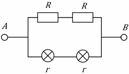 9. (6 баллов) На рисунке указана цепь, где напряжение между точками А и В составляет 100 В. Сопротивления резисторов равны 10 Ом а сопротивления лампочек – 20 Ом. Найдите мощность лампочек в Вт.