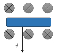 9. (6 баллов) Проводник массой 200 г и длиной 90 см падает в однородном магнитном поле с индукцией 200 мТл так как показано на рисунке. Известно, что достигнув некоторой скорости, проводник перестал ускоряться. Найдите эту скорость, если сопротивление проводника равно 0,1 Ом. Ответ дать в м/с.