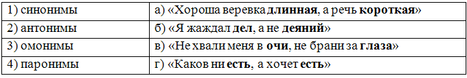 7. (5 баллов) Распределите пословицы по группам в зависимости от того, чем являются по отношению друг к другу выделенные слова. Укажите правильное соотношение. Ответ запишите в виде комбинации цифр и букв без пробелов и каких-либо знаков препинания, цифры должны идти по порядку, например, 1а2г3в