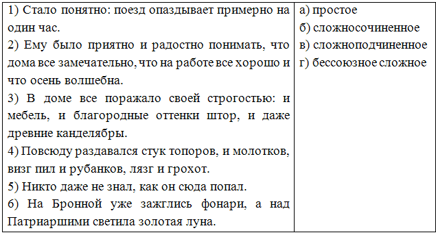 6. (4 балла) Определи, предложение является простым, сложносочиненным, сложноподчиненным или бессоюзным. Установи соответствия. Ответ запиши в виде комбинации цифр и букв без пробелов и каких-либо знаков препинания, цифры должны идти по порядку, например, 1а2в3г4б