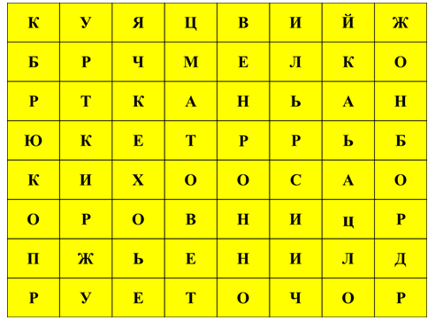 10. (5 баллов) Найди в таблице названия тех предметов, которые Робинзон Крузо перевез на плоту с корабля к себе на остров после кораблекрушения (их 10, это существительные, они даны в начальной форме). Слова могут изгибаться как угодно, но по диагонали двигаться нельзя. Из оставшихся букв составь слово. Это будет настоящая фамилия отца Робинзона Крузо. Получившееся слово запиши в ответе без знаков препинания.