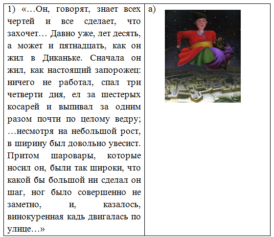 5. (4 балла) По приведенным ниже отрывкам узнай персонажей повести Н. В. Гоголя «Ночь перед Рождеством». Выбери правильное соотношение «характеристика – портрет персонажа». Ответ запиши в виде комбинации цифр и букв без пробелов и каких-либо знаков препинания, цифры должны идти по порядку. Например, 1б2в3а4г