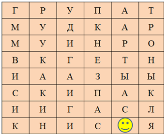 10. (5 баллов) Вспомни произведение «Приключения Гекльберри Финна» Марка Твена. В романе отец главного героя, после того как выкрал мальчика от вдовы Дуглас, держал его в хижине из бревен. После очередной поездки в город «папаша» говорит Геку сходить к ялику и перенести в лачугу то, что он привез. Вспомни, что это были за вещи. Должно получиться 7 слов. Слова могут располагаться в любом направлении, кроме диагонального. Из оставшихся букв получится название штата, в котором происходят события в романе. Запиши его в ответе в именительном падеже без кавычек и знаков препинания. Например, Флорида