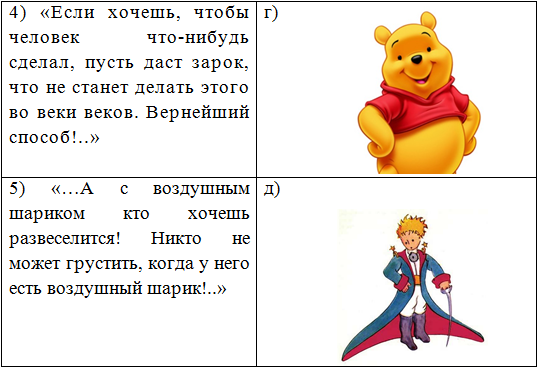 7. (4 балла) Соотнеси высказывание и литературного героя. Установи соответствие между ними. Ответ запиши в виде последовательности цифр и букв без пробелов и знаков препинания, цифры должны идти по порядку, например, 1д2а3в