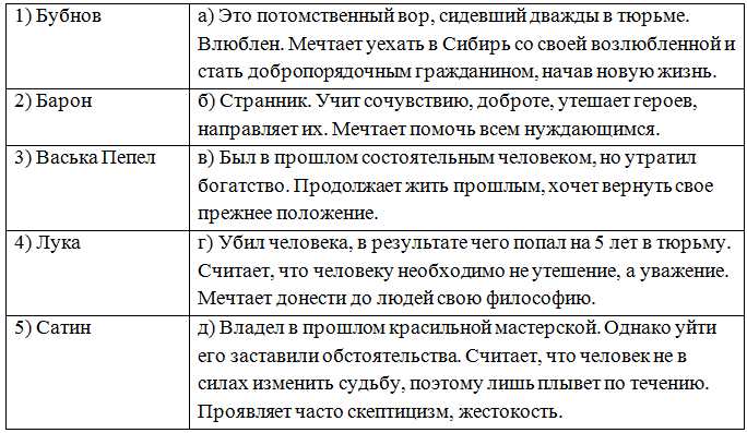 9. (7 баллов) Узнайте героя пьесы М. Горького «На дне». Сопоставьте данные таблицы. В ответе укажите правильный вариант сопоставления, используя комбинацию цифр и букв без скобок, кавычек, пробелов и каких-либо знаков препинания. Цифры должны идти по порядку, например, 1а2в3г
