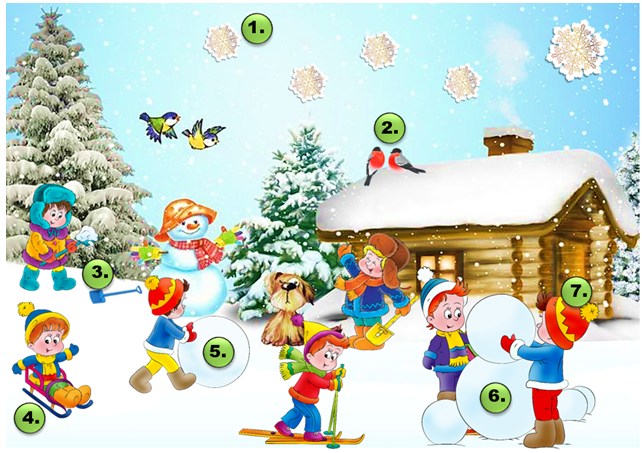 6. (4 балла) Сосчитай, сколько на картинке всего: 1) снежинок, 2) птичек, 3) лопаток, 4) санок, 5) снежных комов (включая снеговика!), 6) снеговиков 7) детей. Выбери подходящий вариант ответа.