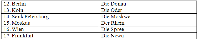 II. (1 балл за каждый пункт) Подсчитай сколько немецких городов, а сколько русских. В ответе запиши только число буквами по-немецки.