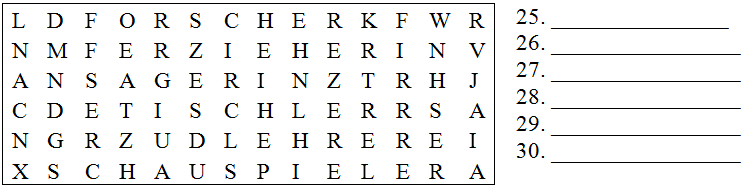 VI. (6 баллов) In diesem Feld sind die Wörter zum Thema „Berufswahl“ versteckt. Finden sie ein Wort in jeder Zeile. В ответе записываем только нужное существительное без знаков препинания и без артикля.