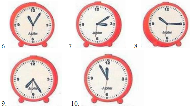 a) Viertel nach zehn b) fünf vor halb acht c) fünf nach elf d) fünf vor zwölf e) zehn nach drei