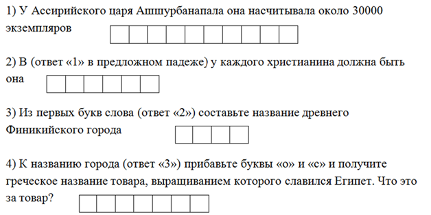 9. (7 баллов) Ответьте ниже на вопросы. Впишите ответы на них в бланки ниже. Далее составьте из букв в заштрихованных полях два слова. Одно слово составьте из букв в поле с горизонтальной штриховкой, второе – с вертикальной. Если штриховка двойная, значит буква будет задействована в двух словах. Впишите получившиеся слова в цитату, поставив их в нужную падежную форму. В ответ запишите два полученных слова строго с одним пробелом, без кавычек и каких-либо знаков препинания так, как они стоят в цитате, например, задаче путь
