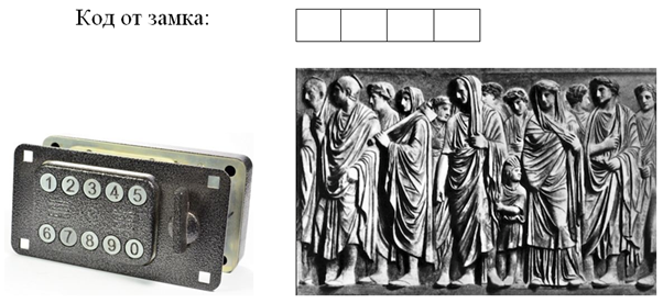 10. (6 баллов) Чтобы выпустить пленников, вам надо подобрать код к замку. Кодом будут служить ответы на вопросы ниже. Ответ на первый вопрос будет первой цифрой кода, на второй – второй цифрой кода и так далее. Всего код должен состоять из четырех цифр. В ответе указать получившийся код в виде числа без каких-либо знаков препинания, например, 1235