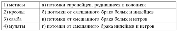 4. (2 балла) Соотнесите следующие группы населения и их происхождение. Ответ запишите в виде комбинации цифр и букв без пробелов и каких-либо знаков препинания, цифры должны идти по порядку, например, 1а2г3в4б