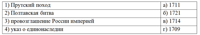 3. (1 балл) Соотнесите события и даты эпохи правления Петра I.