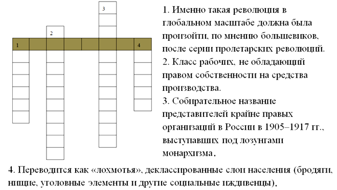 7. (5 баллов) Решите кроссворд и разгадайте ключевое слово, обозначающее единичного представителя одного из слоёв общества, распространившегося в России в начале ХХ века. Ответы в кроссворде давайте в единственном числе. Запишите ключевое слово в ответе без кавычек и каких-либо знаков препинания, например, буржуа