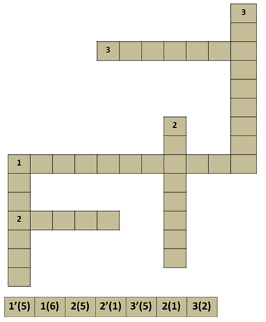 9. (7 баллов) Решите кроссворд. После этого впишите в бланк ответа нужные буквы. Сделать это нужно следующим образом: в бланке указан номер слова, а в скобках порядковый номер буквы в этом слове. Цифра со штрихом обозначает слово по вертикали, без штриха – по горизонтали. Например, 1’(5) значит, что в бланк вставляем 5-ую букву 1-го слова по вертикали. После заполнения бланка, из полученных букв вы должны составить слово, означающее одну из форм проявления несогласия населения. Запишите полученное слово в ответе без кавычек и каких-либо знаков препинания, например, террор