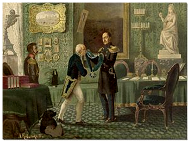 5. (3 балла) Рассмотрите картину. Кому вручает награду Николай І за составление единого свода законов? В ответе запишите фамилию этого человека без кавычек и каких-либо знаков препинания, например, Карамзин