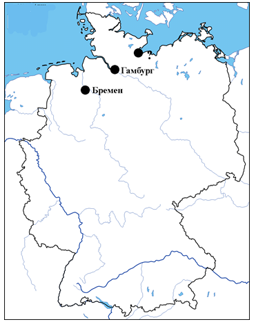6. (3 балла) На карте отмечены города, которые вошли в состав объединённой Германии в 1871 году в статусе вольных городов. Какой город отмечен на карте знаком вопроса? Запишите название этого города в ответе без кавычек и каких-либо знаков препинания, например, Мюнхен