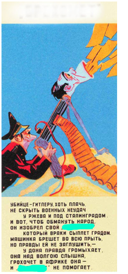 9. (6 баллов) Посмотрите на карикатуру периода Великой Отечественной войны. Здесь скрыто её название, которое встречается в тексте, где также скрыто. Восстановите пропущенное слово, которое обозначает буквально «аппарат для обмана» и является производным от вида оружия. Запишите в ответе полученное слово в именительном падеже, без кавычек и каких-либо знаков препинания, например, враньёметатель