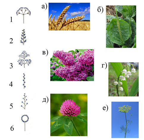 6. (4 балла) Соотнесите типы соцветий и растения, имеющие такие соцветия. Ответ запишите в виде сочетания цифр и букв без пробелов и каких-либо знаков препинания, располагая цифры в порядке возрастания, например, 1а2б3в