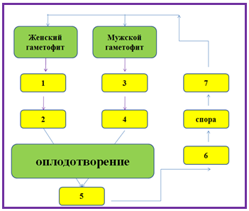 5. (4 балла) Укажите стадию жизненного цикла кукушкина льна, обозначенную на рисунке цифрой 2.