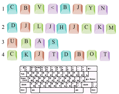 7. (5 баллов) Используя клавиатуру, расшифруйте четыре слова: