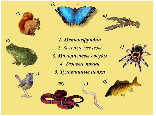 5. (4 балла) Соотнесите изображённых на рисунке животных и названия органов выделения, характерных для них. Ответ запишите в виде сочетания цифр и букв без пробелов и каких-либо знаков препинания, располагая цифры в порядке возрастания, а буквы, стоящие за ними, — в алфавитном порядке, например 1ав2бгде