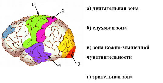 6. (4 балла) Соотнесите названия зон коры больших полушарий и их расположение. Ответ запишите в виде сочетания цифр и букв без пробелов и каких-либо знаков препинания, располагая цифры в порядке возрастания, например 1а2б3в4г