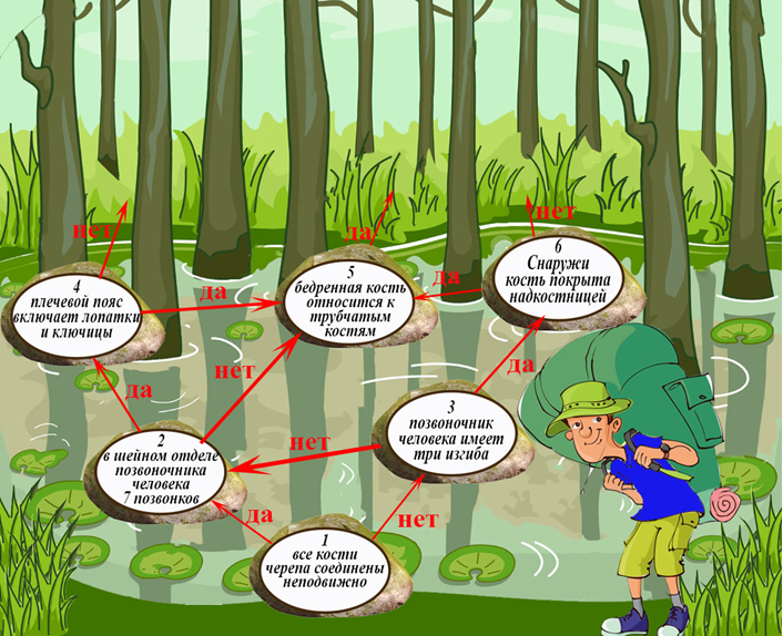 8. (6 баллов) Помогите туристу перебраться на другой берег, соглашаясь или нет с утверждениями. По каким камням будет переступать турист? Ответ запишите в виде последовательности цифр, начиная с номера 1, без пробелов и каких-либо знаков препинания, например 1234